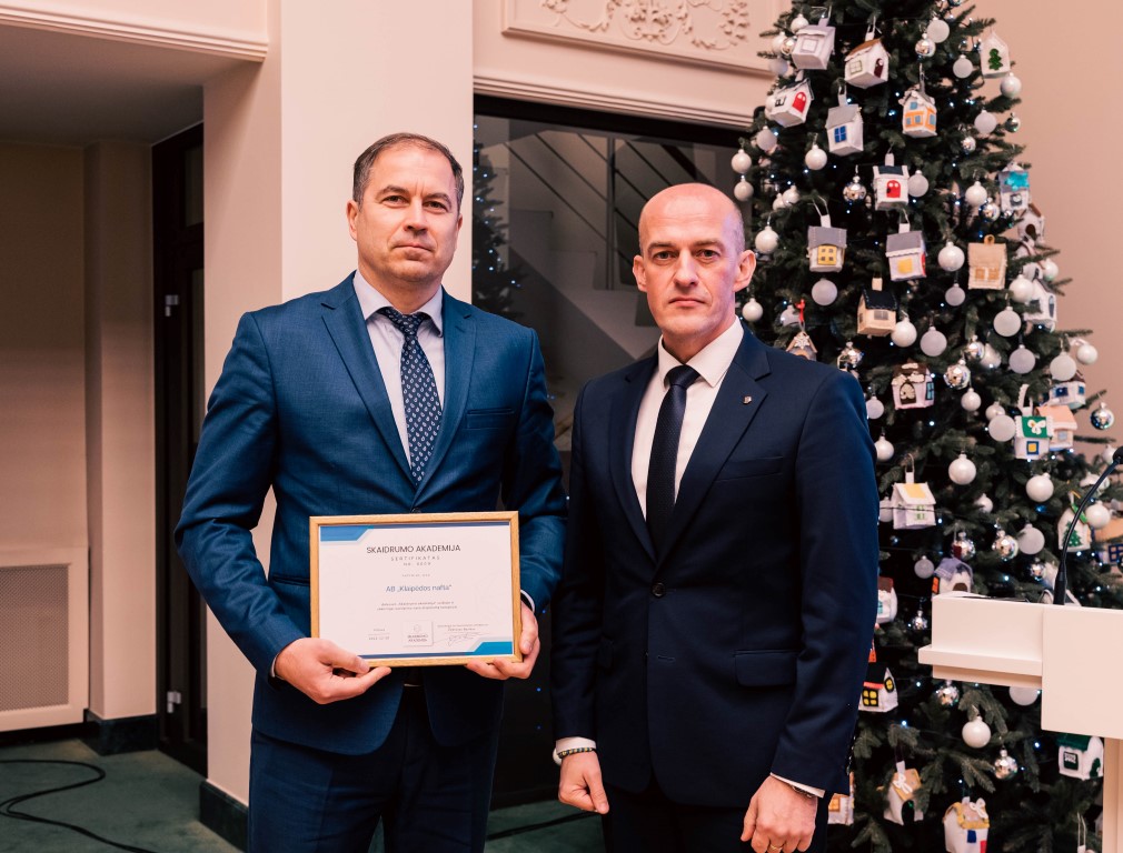 In 2021-2022, AB Klaipėdos nafta (hereinafter – KN) participated in the Transparency Academy, an exchange project on good anti-corruption practices. The project was concluded at the Transparency Celebration held at the Presidential Palace of the Republic of Lithuania, during which the Director of the Special Investigation Service (STT) Žydrūnas Bartkus handed over the certificate of the Transparency Academy to KN.